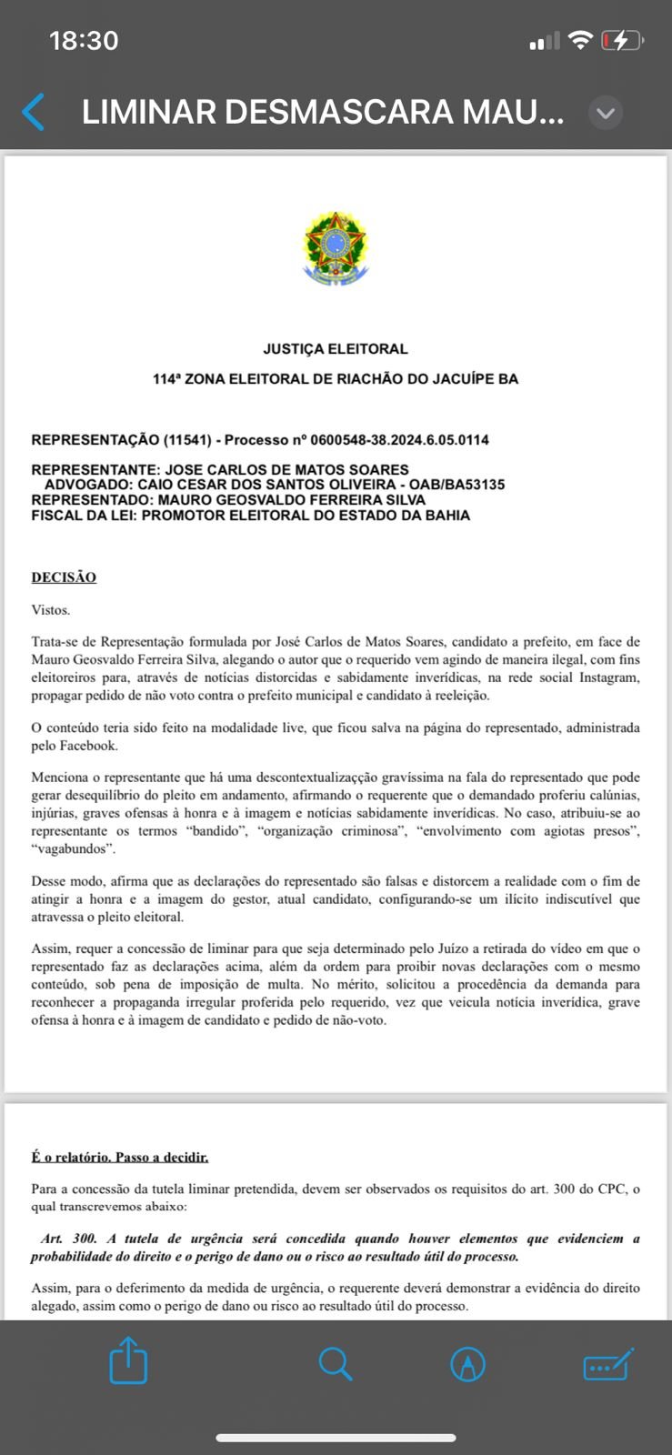 A juíza eleitoral da 114ª Zona Eleitoral, com sede em Riachão do Jacuípe, acolheu o pedido de liminar solicitado pelo candidato a prefeito, o senhor José Carlos de Matos Soares (UNIÃO), contra o senhor Mauro Geosvaldo, para que o mesmo remova de forma imediata um conteúdo que o mesmo publicou em suas redes sociais desferindo ao candidato ofensas gravíssimas, bem como caluniando-o através de falas descontextualizadas e que ferem a sua honra e dignidade.
