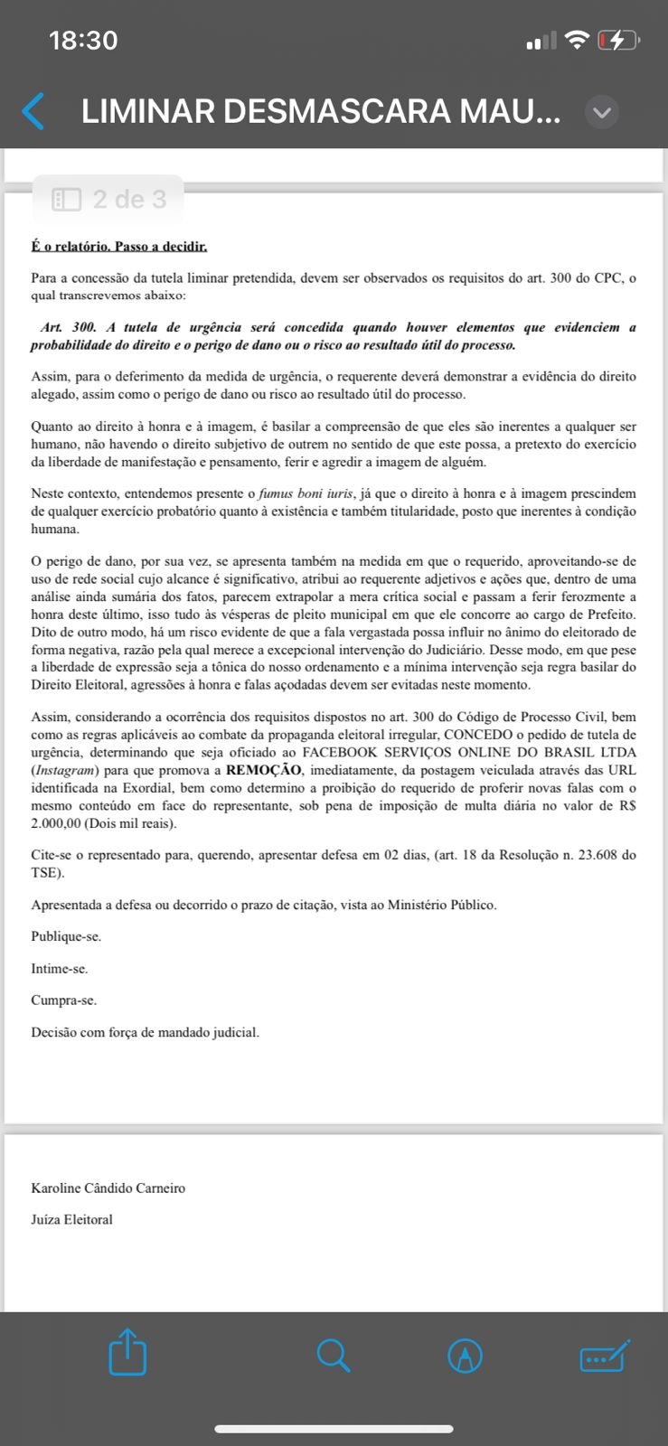 Na decisão, a juíza eleitoral, a senhora Karoline Cândido Carneiro determina que, além da remoção, o advogado está proibido de citar em novas falas, seja com o mesmo conteúdo ou algo contra o candidato Carlinhos. Vale ressaltar que o descumprimento das medidas levará o mesmo à pena de multa diária de R$ 2.000,00 (dois mil reais).