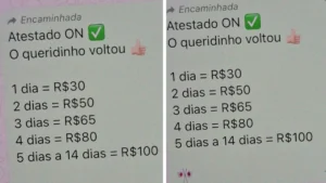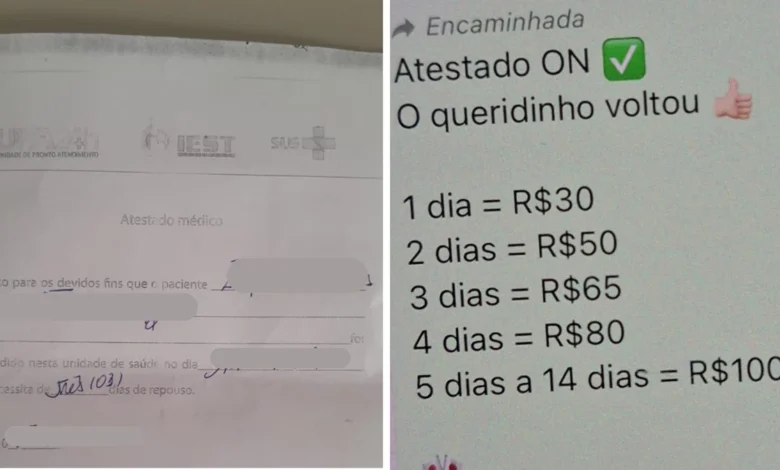 O elo entre os dois casos é um esquema de venda de atestados médicos falsos na capital baiana. Uma conversa rápida em um aplicativo de mensagens garante as folgas do trabalho. Os documentos falsificados são vendidos a partir de R$ 30, para um dia de afastamento, e custam até R$ 100, para um período de cinco a 14 dias.