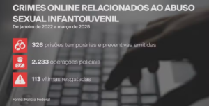 De acordo com a Polícia Federal, de janeiro de 2022 a março de 2025, 2.233 operações foram realizadas contra crimes online relacionados ao abuso sexual infantojuvenil. Só neste ano, entre janeiro e abril, 612 foragidos por crimes sexuais contra crianças e adolescentes foram presos.