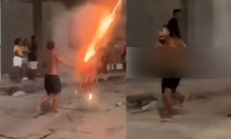 O momento foi compartilhado através de um vídeo em uma rede social. Nas imagens, é possível ver o homem, identificado como Taylon Sousa, com a “espada” na mão. Em seguida, o artefato explode e ele sai correndo desesperado (assista mais acima).