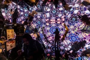 Logo em seguida, um amplificador, também gigante, traz, dentro dele, um caleidoscópio com imagens de Raul. Ponto ideal para fazer um vídeo e postar nas redes sociais. Raul precisa circular. Na sala que aborda Mosca na Sopa, uma parede com espelho faz o visitante dar de cara consigo. O que você está fazendo para perturbar o sistema?