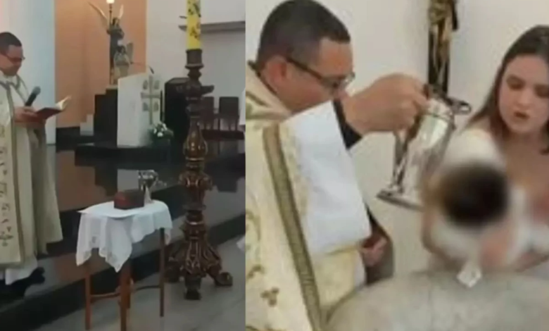 As imagens capturadas por uma tia durante a celebração mostram o momento em que familiares pedem ao religioso que diga o nome da menina. O padre, no entanto, insiste em se referir a ela apenas como “a criança” ou “a filha de vocês”.
