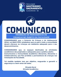 Um comunicado da Faculdade Santíssimo Sacramento, em Alagoinhas (BA), provocou indignação entre a comunidade acadêmica. Na terça-feira (14), a instituição anunciou a proibição de crianças no campus. De acordo com a nota, a determinação atende ao Estatuto da Criança e do Adolescente (ECA).