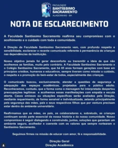 “É revoltante ver uma faculdade proibir a presença de crianças, como se ser mãe fosse um erro. Essa regra exclui justamente quem mais enfrenta dificuldades para continuar estudando: as mulheres que cuidam, que lutam, que resistem todos os dias”, pontuou outro. Dois dias depois, nesta quinta-feira (16), a faculdade publicou uma nota de esclarecimento, reafirmando sua posição.