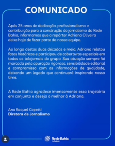 A emissora divulgou uma nota sobre a saída da profissional:
