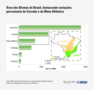 O Instituto Brasileiro de Geografia e Estatística (IBGE) divulga hoje (18) uma revisão nos limites dos biomas Cerrado e Mata Atlântica entre os estados de Minas Gerais e São Paulo. Houve um acréscimo de 1,8% no Cerrado e uma redução de 1,0% na Mata Atlântica. A área com alteração dos limites representou aproximadamente 19.869 km² do território brasileiro, sendo 816 km² em Minas Gerais e 19.053 km² em São Paulo. Outros biomas não foram avaliados dessa vez.