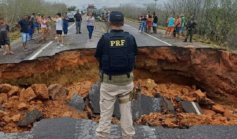 A erosão ocorreu na manhã de sexta-feira (21), no KM 296, quando o volume de água provocado pelas fortes chuvas bloqueou a vazão de um bueiro, arrastou sedimentos e rompeu o aterro, abrindo uma cratera nas proximidades do povoado de Tracupá. O problema afetou o tráfego no sentido Jorrinho–Araci e deixou a rodovia completamente interditada.