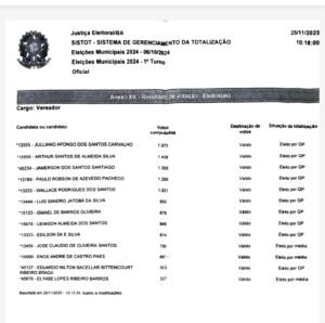 De acordo com a Justiça Eleitoral, os três novos vereadores estão aptos para serem diplomados, e a posse está marcada para a próxima segunda-feira (1º). A atualização da composição legislativa consta no relatório oficial do sistema de totalização do TRE-BA, que redistribuiu as vagas após a decisão judicial.