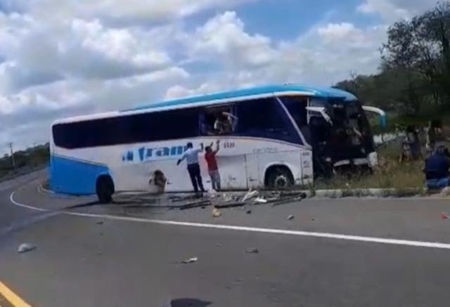 Ainda de acordo com as informações de testemunhas no local, o motorista do caminhão teria feito uma ultrapassagem arriscada e bateu de frente com o ônibus, que foi obrigado a parar fora da pista.