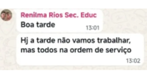 O homem relatou que a determinação teria sido feita pela secretária de Educação, Renilma de Oliveira Rios, por meio de mensagem enviada no grupo oficial da secretaria. “Hoje à tarde, não vamos trabalhar, mas, todos na ordem de serviço”, diz a mensagem da secretária.