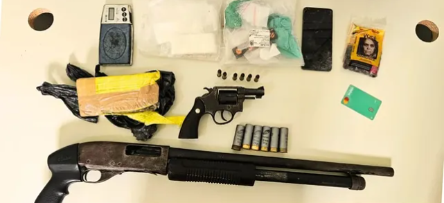 Após as guarnições se dividirem e alcançarem os suspeitos, os PMs encontraram duas armas, munições, drogas e materiais usados no tráfico.