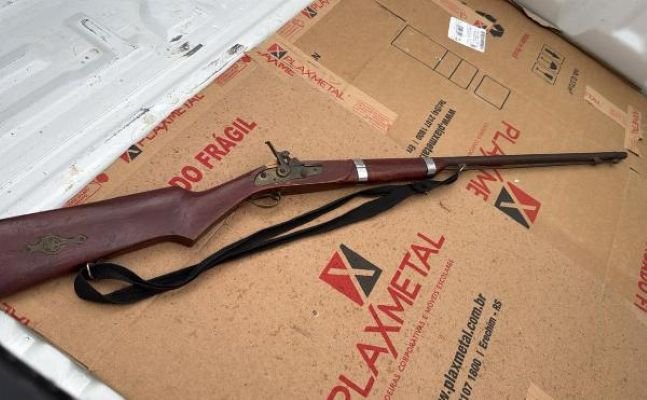 Arma apreendida – Durante o cumprimento do mandado de prisão, os policiais apreenderam uma espingarda de fabricação artesanal em posse do suspeito.